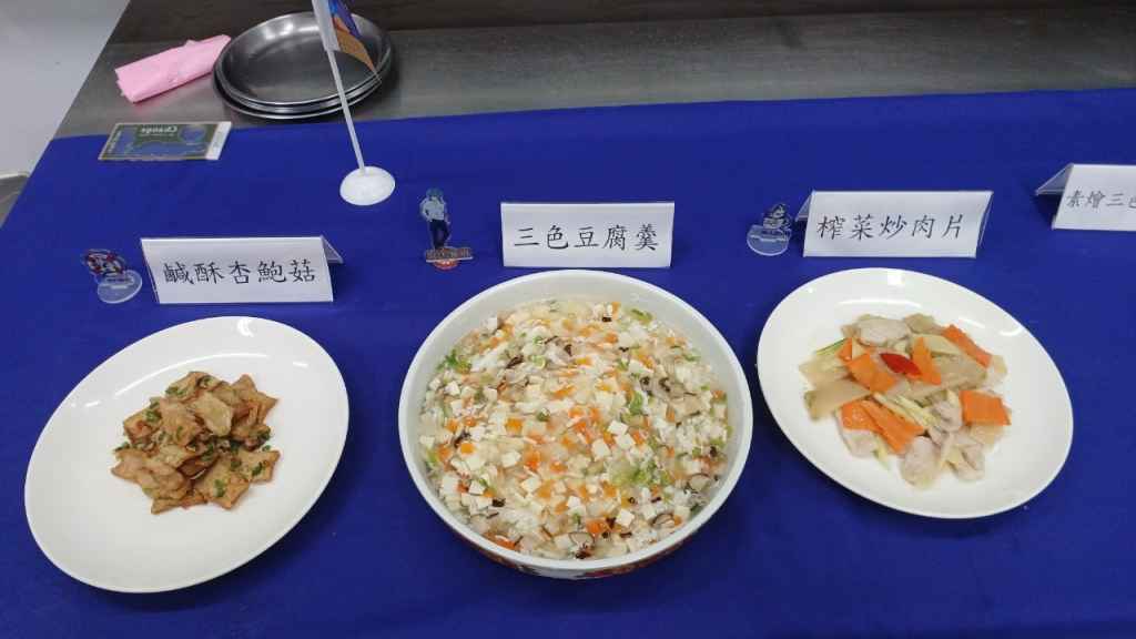 301-7 榨菜炒肉片 香酥杏鮑菇 三色豆腐羹 301-8 脆溜麻辣雞球 銀芽炒雙絲 素燴三色杏鮑菇